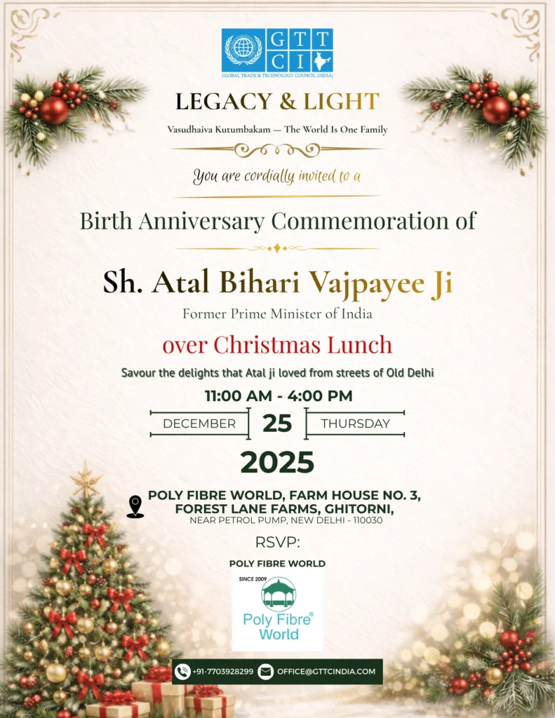 The Global Trade & Technology Council (India) (GTTCI), in association with Poly Fibre World, organised a dignified and warm commemoration of the birth anniversary of Atal Bihari Vajpayee on 25 December 2025 at the Poly Fibre World Farm, New Delhi. The observance was thoughtfully aligned with a Christmas luncheon, symbolising India’s inclusive ethos and the timeless spirit of Vasudhaiva Kutumbakam—the world as one family.