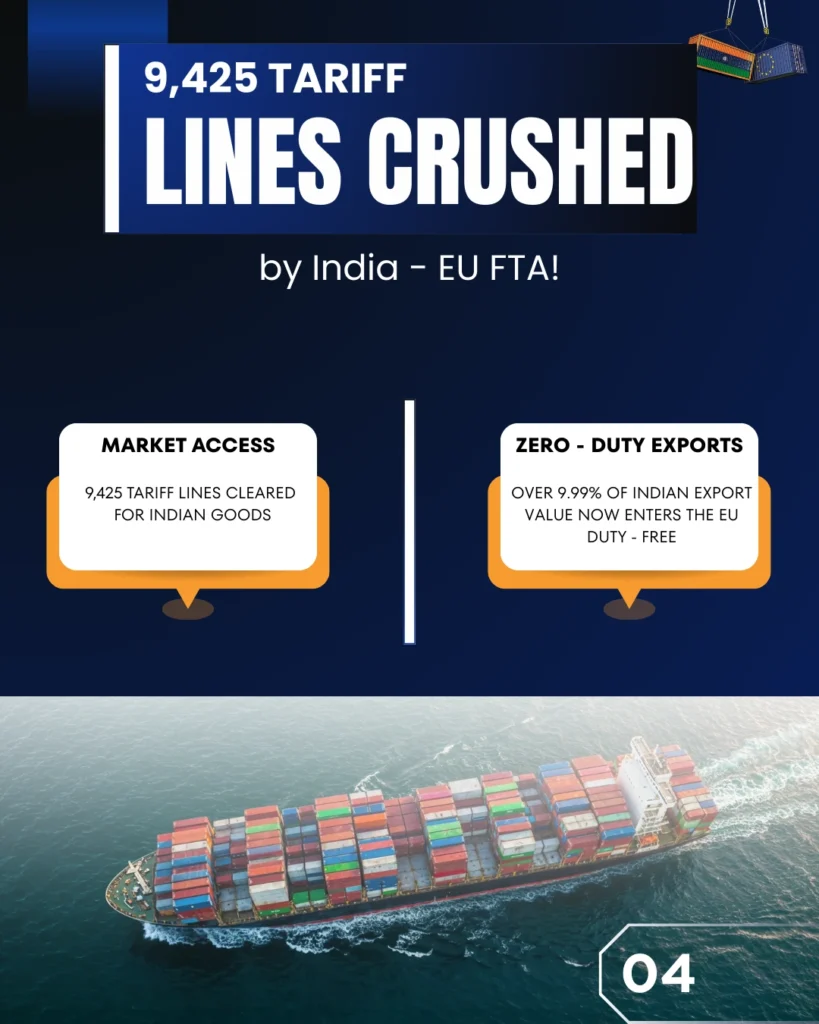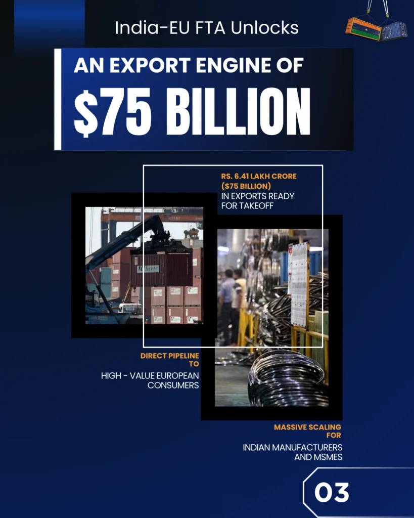 At the heart of the agreement lies a powerful export opportunity. With exports valued at ₹6.41 lakh crore (approximately USD 75 billion) ready for take-off, the FTA unlocks preferential access for Indian goods to high-value European consumers. A major breakthrough comes with the abolition of tariffs across 9,425 product lines, enabling over 9.99% of India’s export value to enter the EU market duty-free. This zero-duty access creates a direct pipeline for Indian manufacturers and MSMEs to scale operations, enhance competitiveness, and integrate deeply into global value chains.