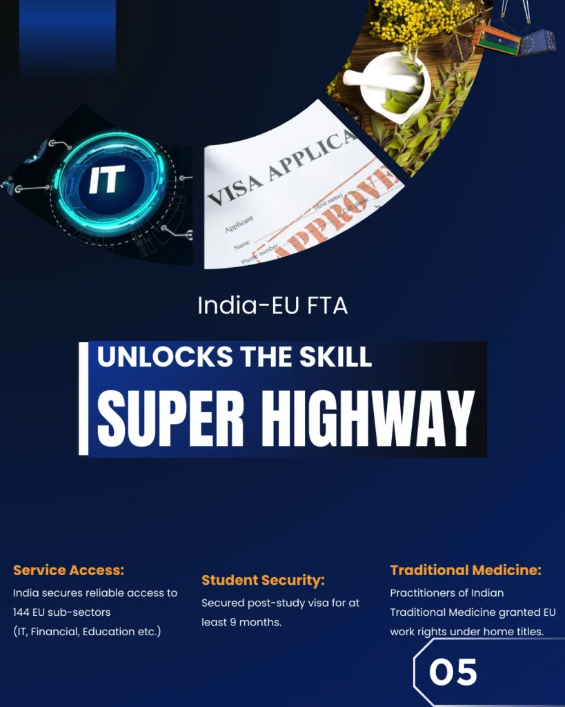 Beyond goods, the agreement opens a super-highway for services and skills. India has secured reliable access to 144 EU services sub-sectors, including IT, financial services, and education. Students benefit from post-study visa security of at least nine months, while practitioners of Indian traditional medicine gain EU work rights under their home-country professional titles.