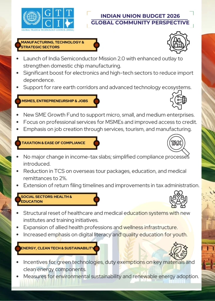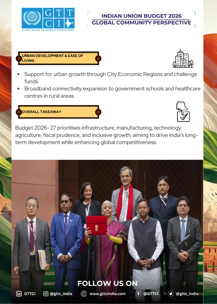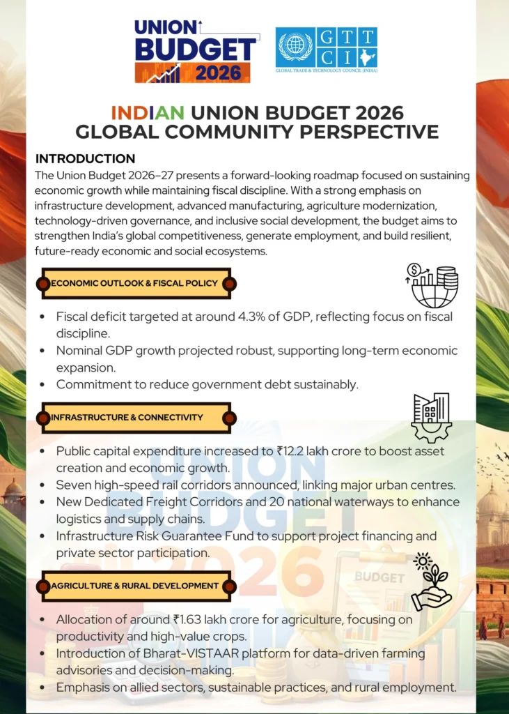The Union Budget 2026–27 reflects a strategic balance between growth, reform, and resilience. With strong investments in infrastructure, technology, manufacturing, and human capital, the budget strengthens India’s long-term development trajectory while enhancing its global competitiveness—an outlook aligned with GTTCI’s vision of trade-driven, technology-enabled economic progress.