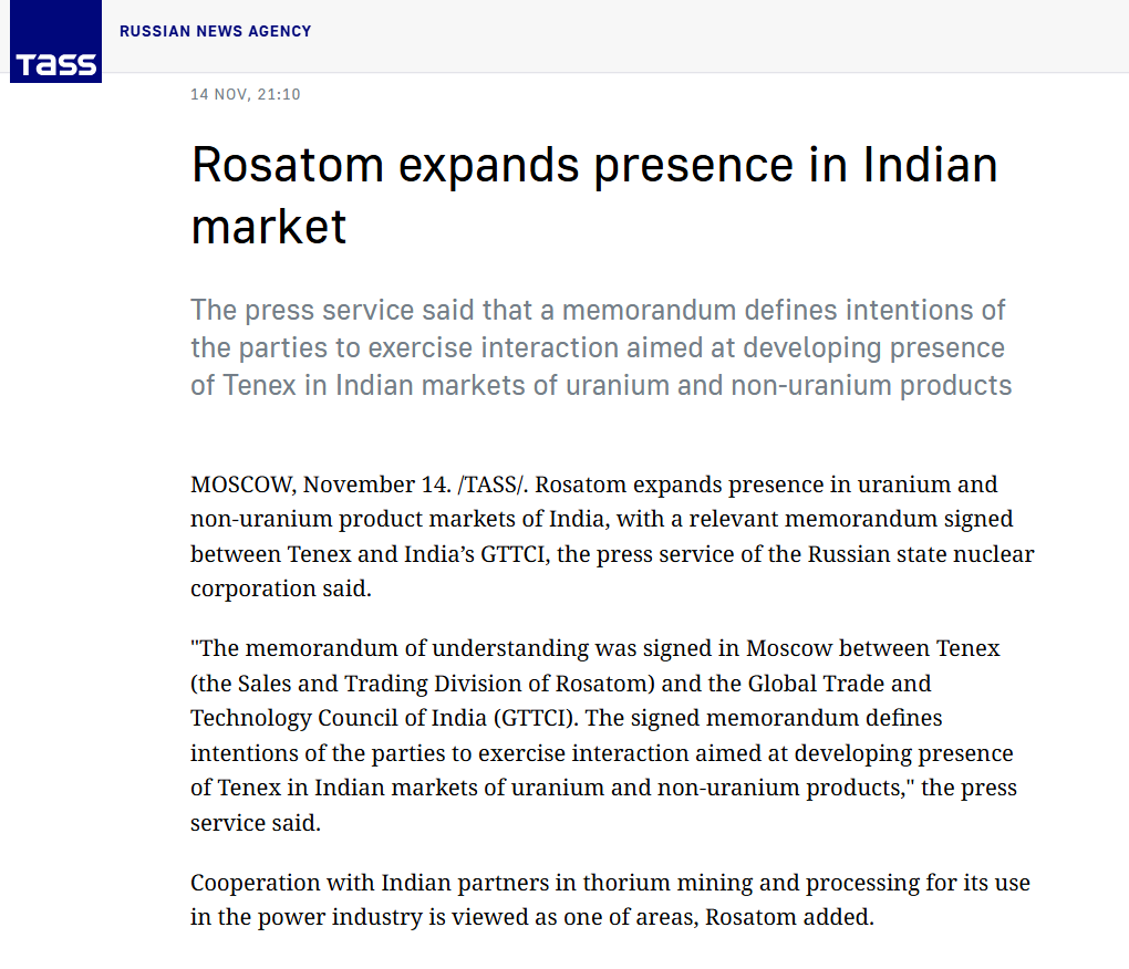 The MoU establishes a framework for cooperation aimed at supporting TENEX in developing long-term collaboration with local partners in India’s uranium and non uranium markets.