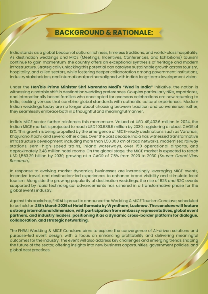 The conclave will be held on 28th March 2026 at Ramada Plaza by Wyndham, Lucknow, a city celebrated for its heritage, culture, and hospitality excellence. The event will feature keynote addresses, panel discussions, B2B networking sessions, and knowledge-sharing forums focusing on destination branding, sustainable tourism, policy frameworks, investment avenues, AI-driven event solutions, and international collaborations in wedding and MICE tourism.