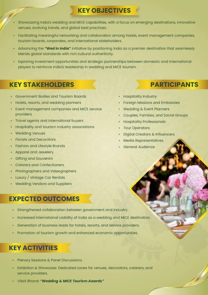 India’s wedding and MICE tourism sector is gaining strong global momentum, driven by its cultural richness, diverse destinations, and expanding hospitality ecosystem. The Wedding & MICE Tourism Conclave 2026 serves as a high-impact platform bringing together policymakers, tourism boards, hospitality leaders, destination planners, and global stakeholders to explore emerging opportunities and partnerships.